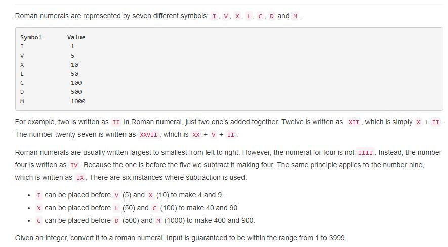 把数字转换成罗马数字,正常情况就是把每个字母相加,并且大字母在前,小字母在后,上边也介绍了像 4 和 9 那些特殊情况。
