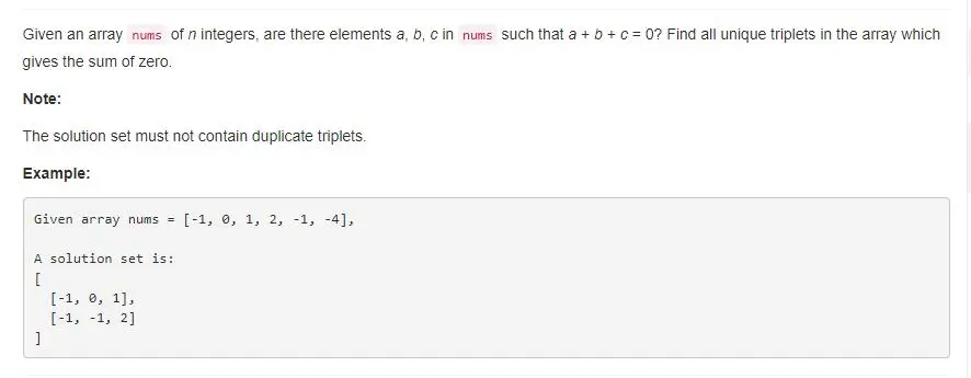 主要思想是,遍历数组,用 0 减去当前的数,作为 sum ,然后再找两个数使得和为 sum。