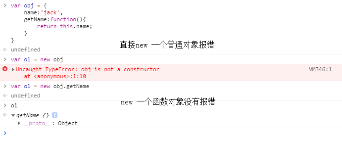 我们看到new一个普通对象报错,new一个函数对象才可以,对于这个结果很好奇为什么?于是又查资料。