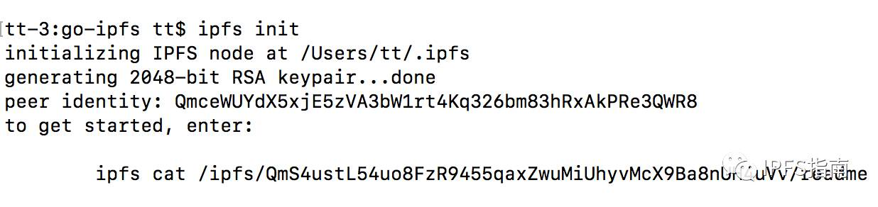 上面是在小编的电脑上的输出结果,表明ipfs的初始化配置完成,ipfs生成了一个节点id:QmceWUYdX5xjE5zVA3bW1rt4Kq326bm83hRxAkPRe3QWR8,每个人的电脑执行结果会不一样,这串字符串就代表了你运行的ipfs节点。