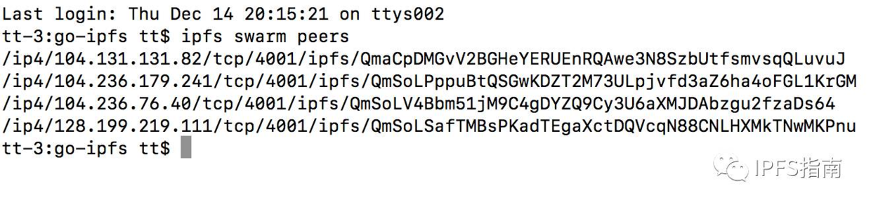 可以看到类似下面的输出,恭喜你,你可以看到截止到目前你的节点连接到到其他ipfs节点。
