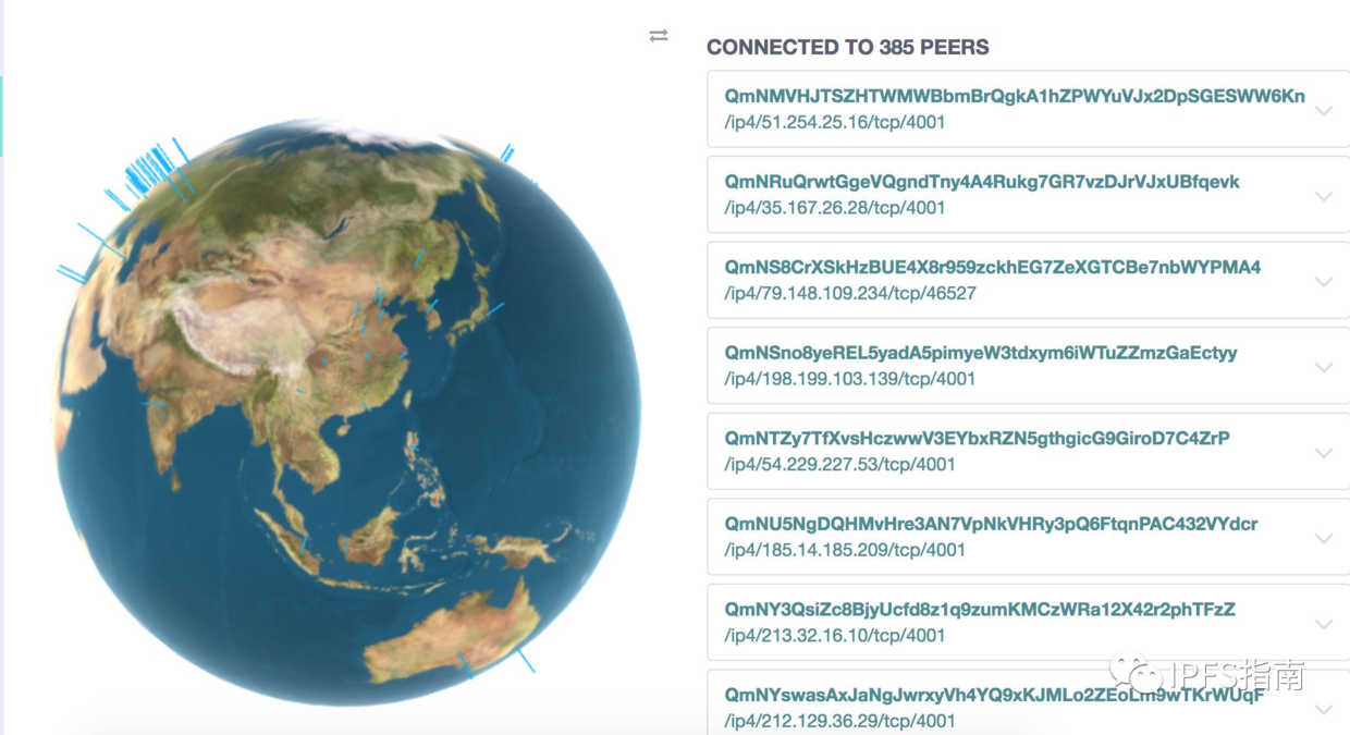 从下图可以看到小编的机子已经连接了世界上385个节点了。从左边的地球上看,中国运行的节点并不多,大部分节点运行在欧洲和美国。