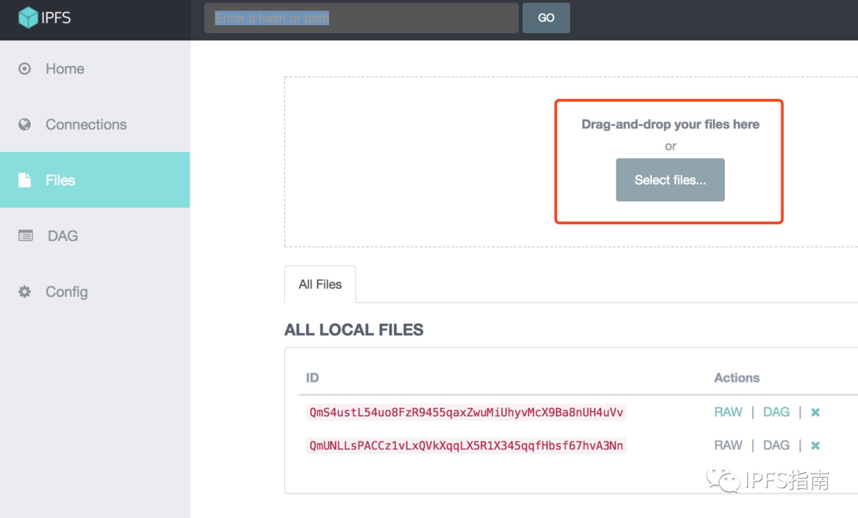 然后点击界面的左边 Files菜单,在右边里面可以看到 Select files,这就是web界面提供的上传文件功能,只需要选中文件,点击上传就好了。