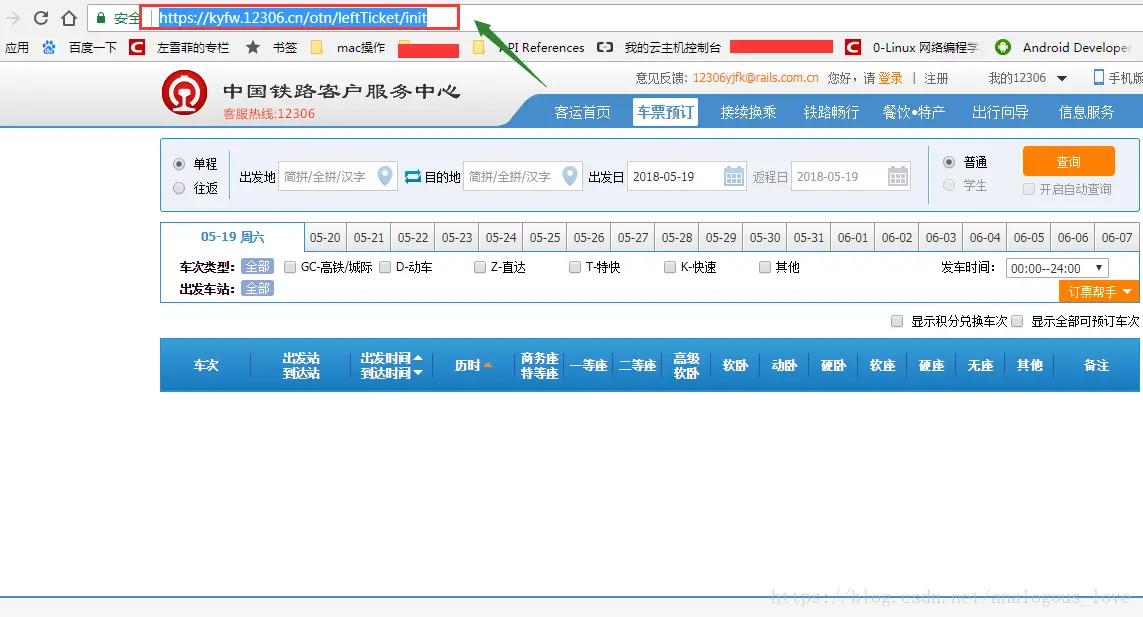 看上图,我们可以看出来,每个站点信息都是通过@符号分割,然后通过|分割每一个站点的各种信息。这样的话,根据上文的格式假如我们要查询2018年5月30日从长春到南京的火车普通票,就可以通过网址kyfw.12306.cn/otn/leftTic…。