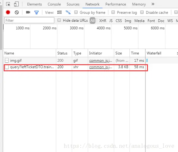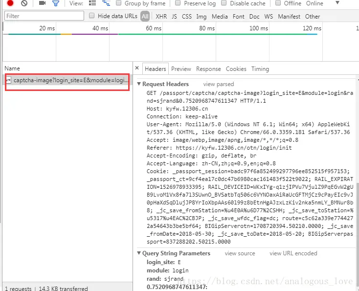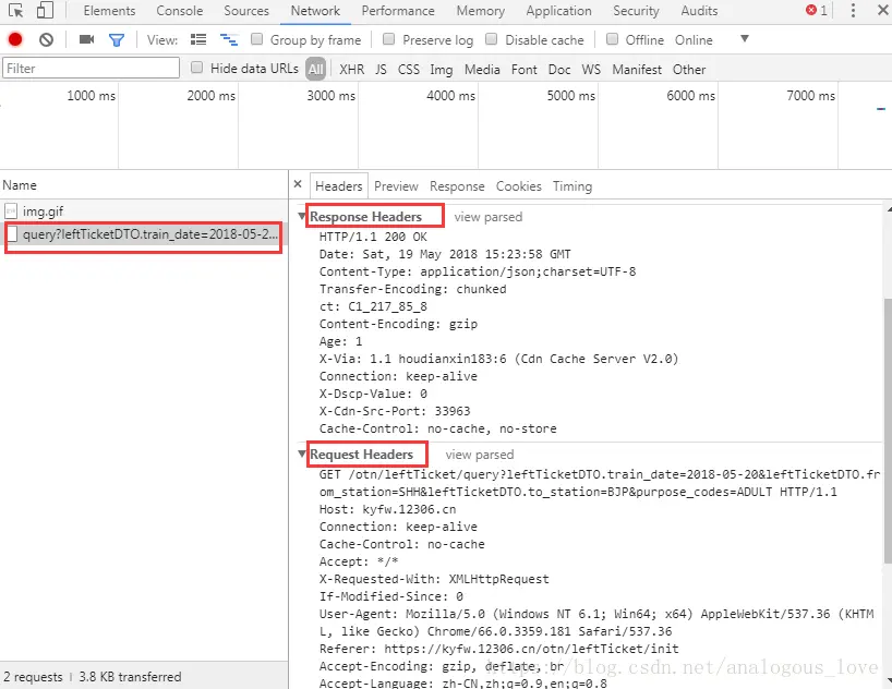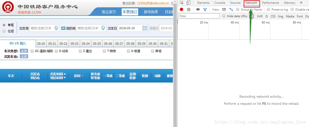 打开后页面变成二分窗口了,左侧是正常的网页页面,右侧是浏览器自带的控制台,当我们在左侧页面中进行操作后,右侧会显示我们浏览器发送的各种http请求和应答。我们这里随便查一个票吧,如查2018年5月20日从上海到北京的票,点击查询后,我们发现右侧是这样的: