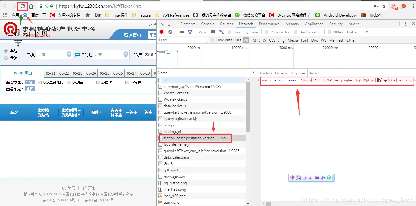但是,读者可能会问,这里的出发站和到达站分别是SHH和BJP,这些站点代码,我如何获得呢?因为只有知道这些站点编码我才能自己购买指定出发站和到达站的火车票啊。如果您是一位细心的人,您肯定会想到,我们查票的时候再进入查票页面,这些站点信息就已经有了,那么可能是在这个查票页面加载时,从服务器请求的站点信息,所以我们刷新下查票页面,发现果然是这样: