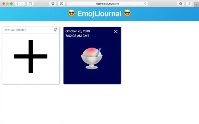 刷新或打开localhost:8090 / client,添加表情符号,然后 - 在Docker cleanup终端窗口中 - 停止并删除两个容器: