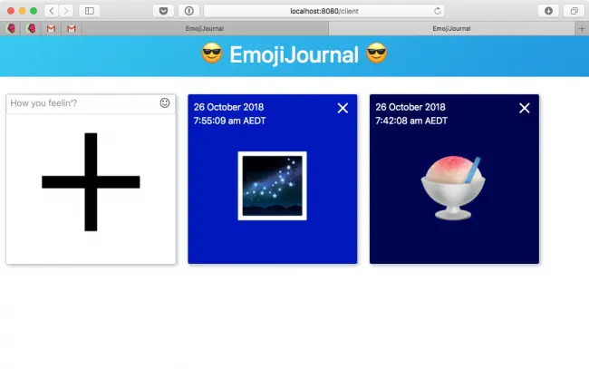 现在,为了证明在删除CouchDB容器后表情符号数据库仍然存在:在Docker run终端窗口中重新运行CouchDB命令,在EmojiJournalServer终端窗口中运行EmojiJournalServer命令,然后刷新localhost:8090 / client - 这次,你不会丢失你的表情符号!
