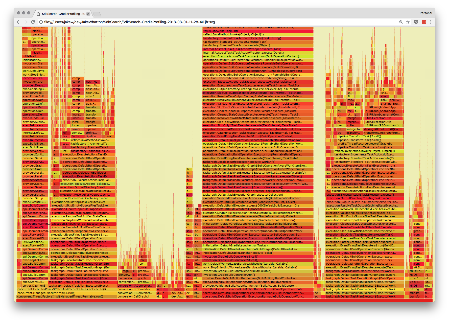 两者都不完美,但两者在不同情况下都有用。希望将来对工作人员的可见性将添加到Chrome跟踪中。弄清楚如何将Java Flight Recorder数据合并到Chrome跟踪中也是一个惊人的补充。目前,在CI上运行Chrome跟踪可以很好地了解构建的执行情况,然后可以手动或使用Gradle Profiler来使用Java Flight Recorder来深入了解各个任务的性能。