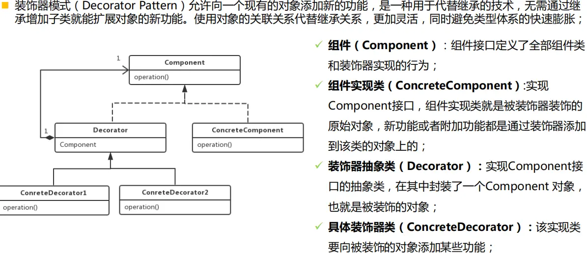 装饰器模式是一种用于代替继承的技术,无需通过继承加子类就能扩展对象的新功能。使用对象的关联关系代继承关系,更加灵活,同时避免类型体系的快速。