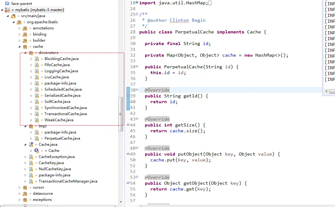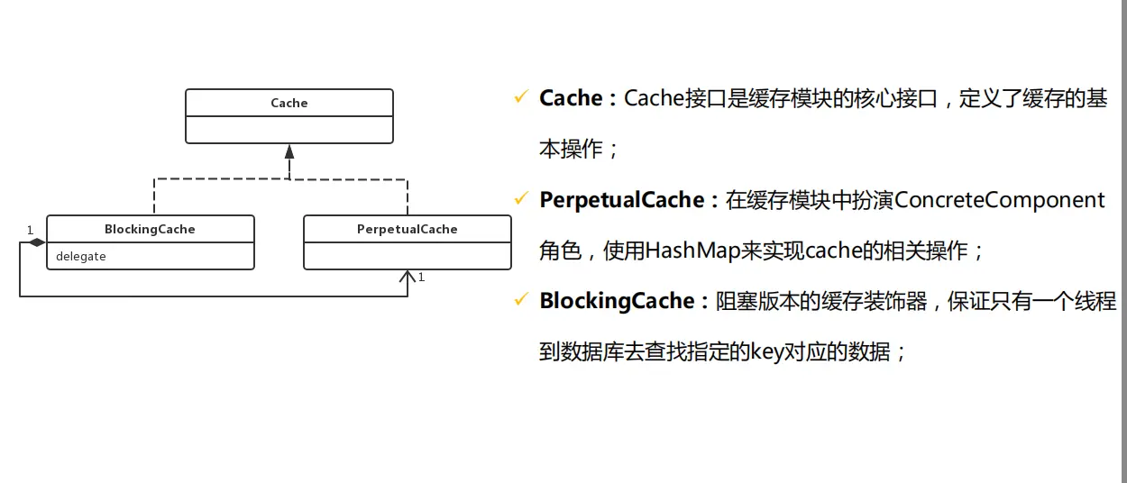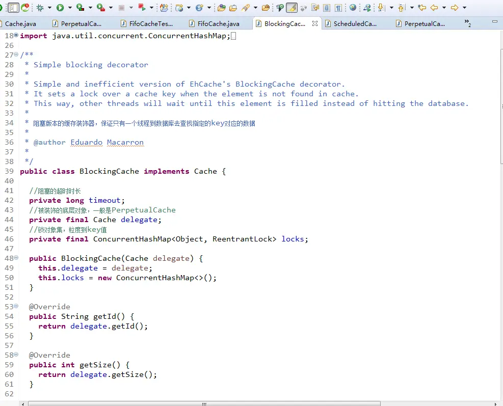 在缓存基本实现类PerpetualCache的基础上,创建了不同的装饰器对缓存进行了功能的增强,例如BlockingCache实现的是阻塞的缓存,FifoCache使用先进先出策略,ScheduledCache定时清空缓存,现在以