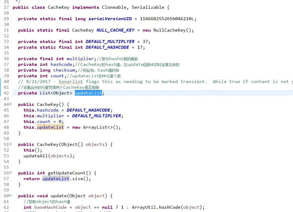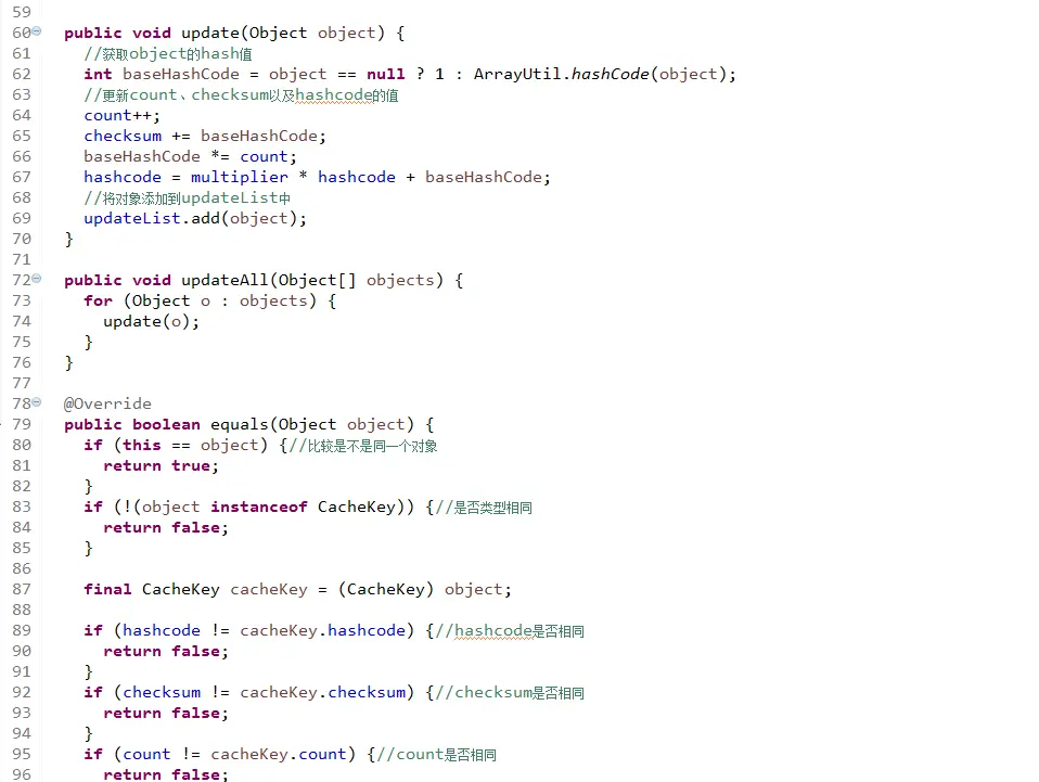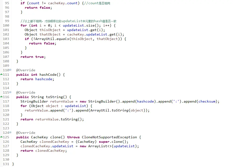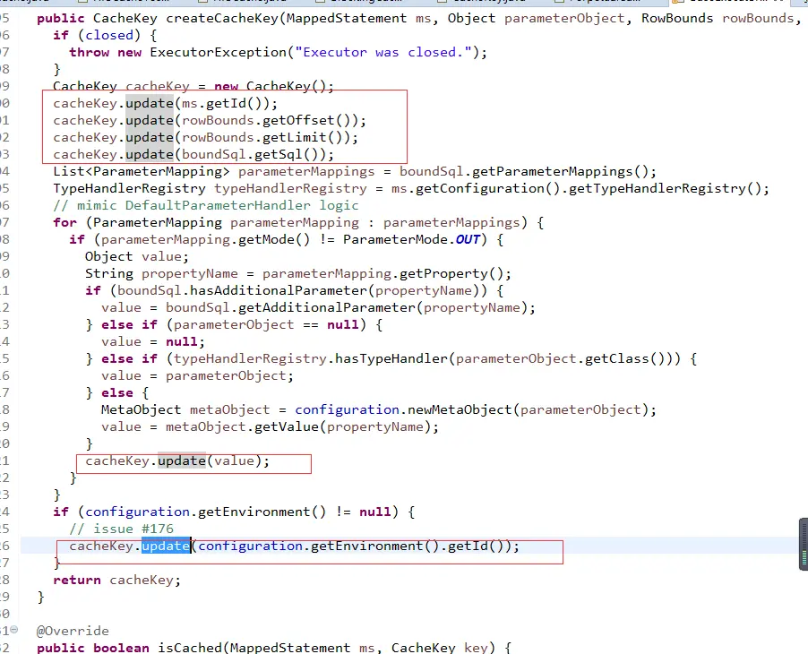 Mybatis中涉及到动态SQL的原因,缓存项的key不能仅仅通过一个String来表示,所以通过CacheKey来封装缓存的Key值,CacheKey可以封装多个影响缓存项的因素;判断两个CacheKey是否相同关键是比较两个对象的hash值是否一致;
