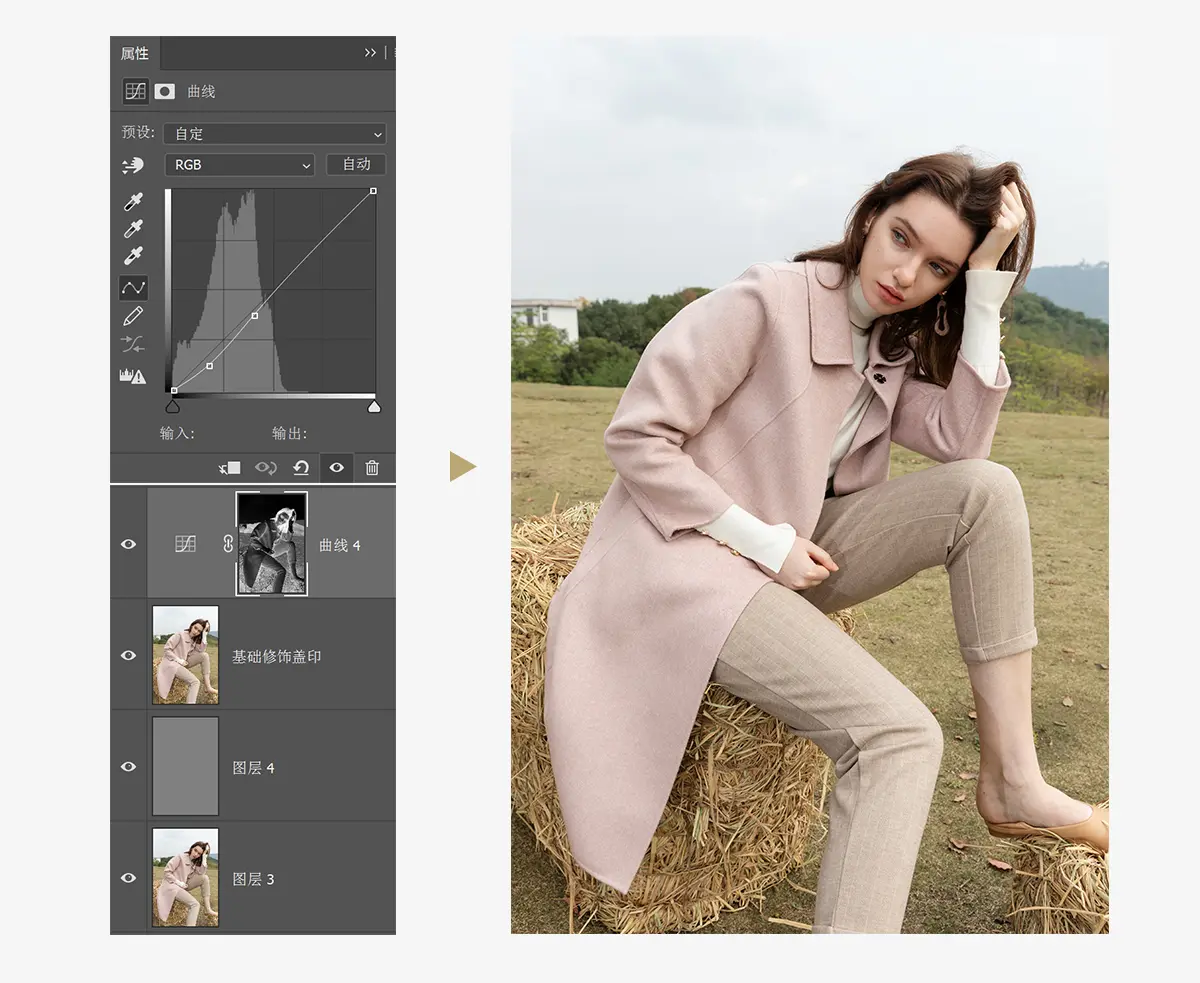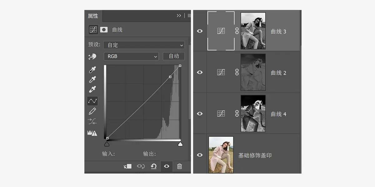 做出中间调选区之后同样建立曲线调整层对中间调进行压暗