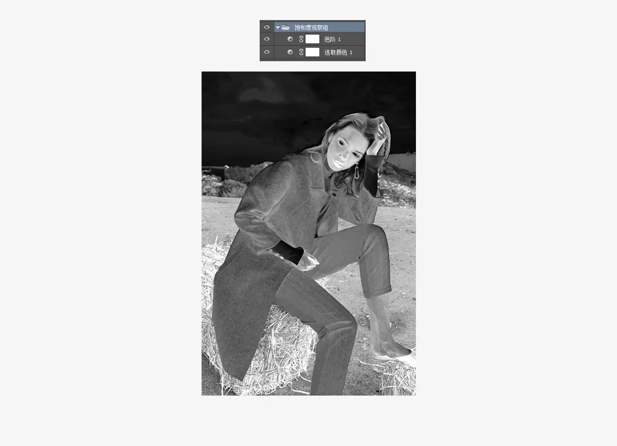 建立饱和度观察组方法:新建可选颜色调整图层,方式改为绝对,把黑白灰下面的黑色拉到最右(+100%),其他颜色的黑色拉到最左(-100%),这时你会得到一个灰度图像,偏暗的地方表示饱和度低,偏亮的地方则表示饱和度高,然后根据观察组再继续给两个饱和度图层涂画蒙版,即可。