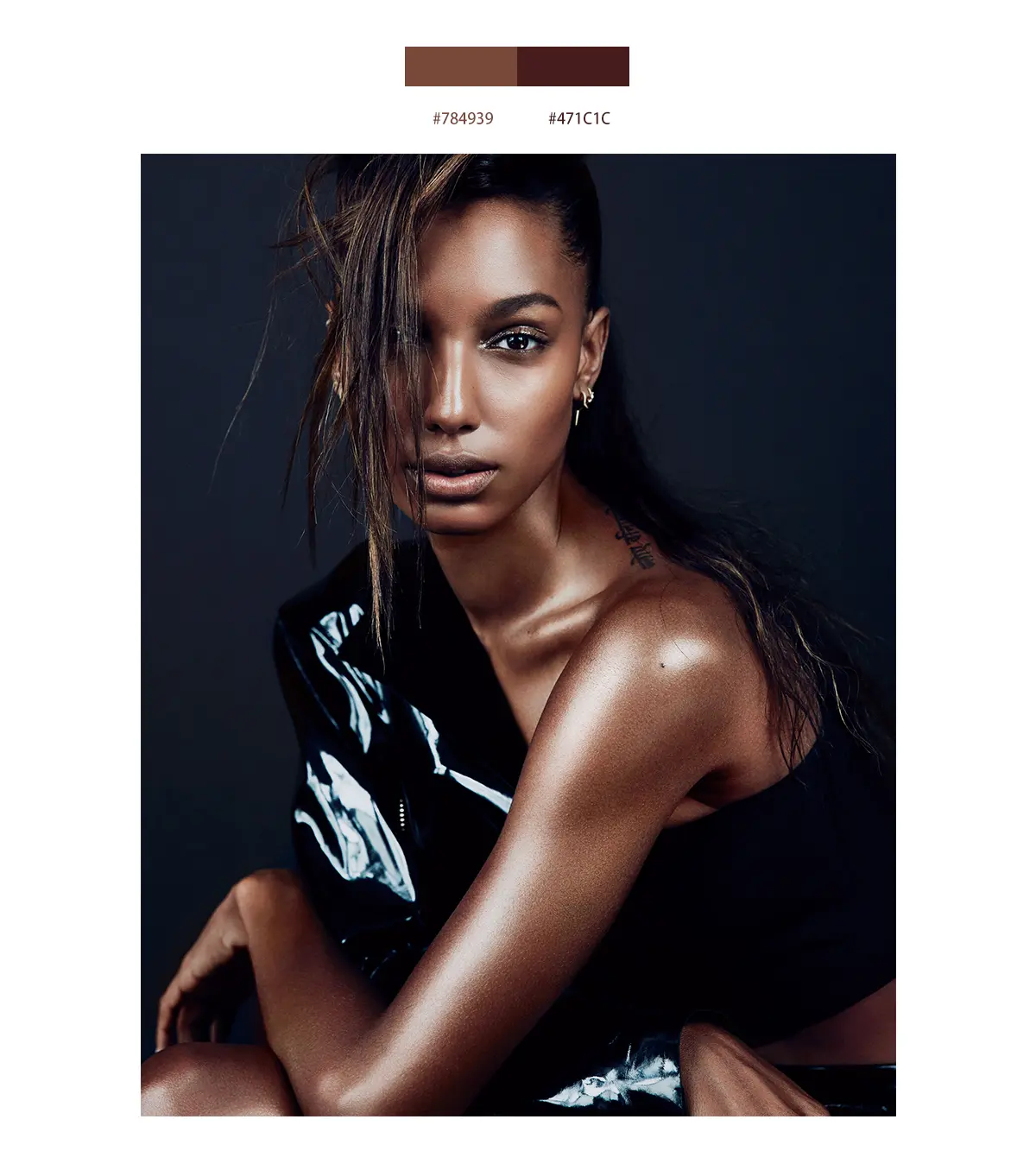 我们以这张VOGUE杂志封面人物为例,用吸管工具吸取主题人物面部颜色,颜色以#facec2、#efbba7为主,分析这两个颜色的数值在颜色直方图中位置均为高明度、低纯度的位置,正是因为明度高、低纯度的色彩有软感才使得这张图看起来十分柔和。适当的降低颜色的纯度就会降低和削减色彩对人情绪的影响,也会让照片看起来比较高档。