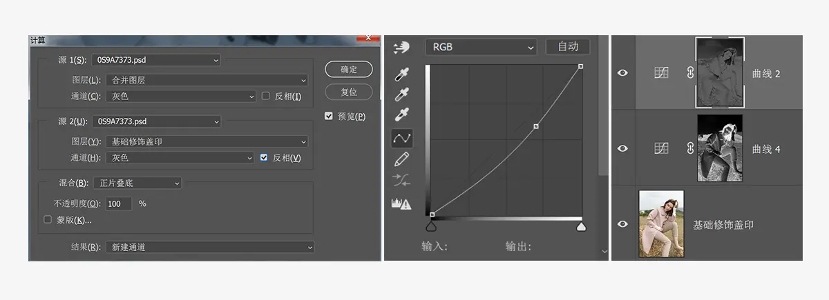 针对这张图我只做了一个暗部选区,建立alpha1通道之后我们按住ctrl鼠标左键点击alpha1通道即可做出暗部选区,然后按ctrl+shift+i反选选区,再回到RGB通道图层中建立一个曲线调整层做一个对比。