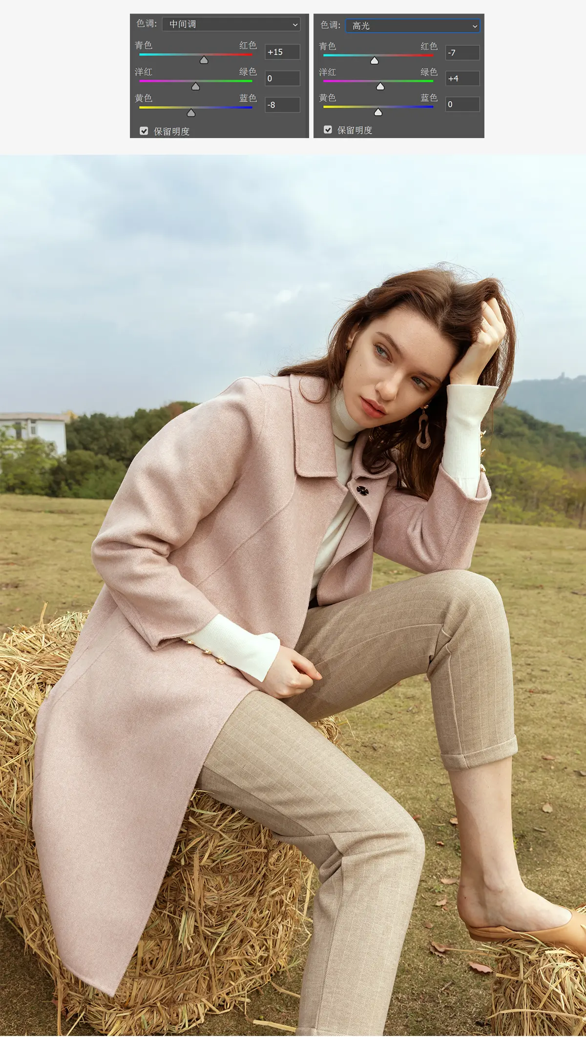 好的,做到这一步,我们去除了照片的灰,丰富了黑白灰的层次关系,统一了主体人物的饱和度及色相,也对环境色进行了分区精调,接下来我们可以调一个色调了,最初我们定的是一个暖调;创建一个色彩平衡调整层对中间调加红加黄,对高光加一点点青和绿,调整如下: