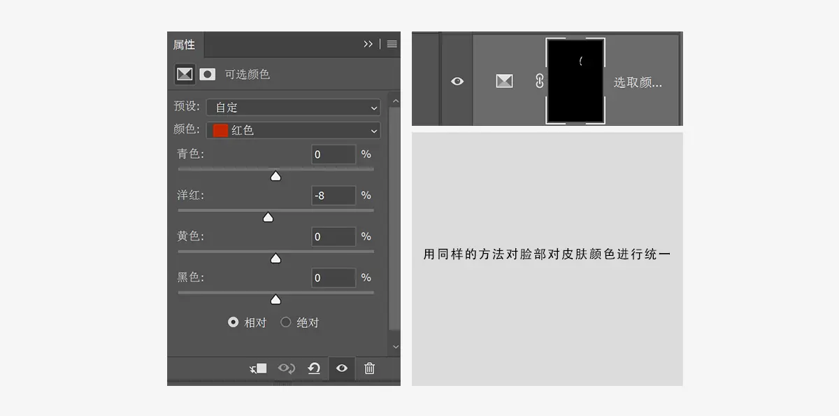 接下来我们再看一下脸部的颜色,头发与脸部相接的部分颜色偏洋红,我们对其作出选区然,在创建一个可选颜色调整层后进行统一色相。