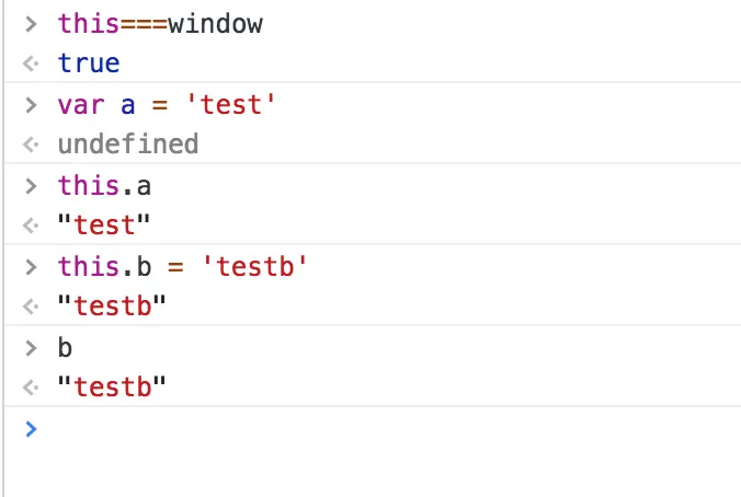 - 在全局执行上下文中(在任何函数体外部)this 都指代全局对象。//在浏览器中,全局对象是window,在node中是global