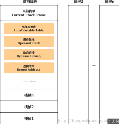 与程序计数器一样,Java虚拟机栈也是线程私有的,虚拟机栈描述的是Java方法执行的内存模型,每个方法在执行的同时都会创建一个栈帧(一个栈帧意味着一个方法的开始和结束)用于存储局部变量表,对象引用,操作数栈,动态链接,方法出口等信息,下图为栈桢结构图: