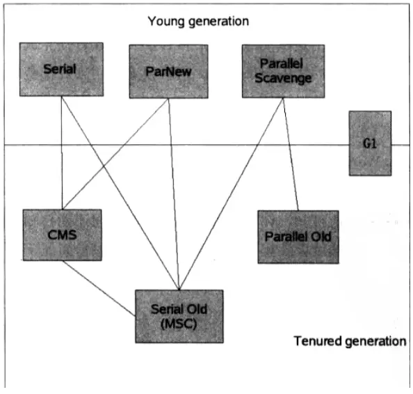 根据实现不同的垃圾收集算法,产生了不同的垃圾收集器。不同的垃圾收集器有不同的作用场景。下图是各垃圾收集器的不同搭配(有直接连线的说明可以一起搭配):