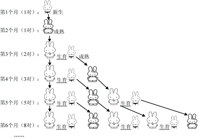 这个问题。答案肯定是 当前月的兔子书 = 上个月的兔子数 + 新生的兔子数。