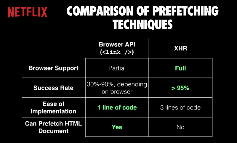 另一方面,XHR 预加载已经成为浏览器标准很多年了,当 Netflix 团队提示浏览器缓存资源时,其成功率达到 95%。但是 XHR 预加载不能预加载 HTML 文档,Netflix 用它来为后续页面预加载 JavaScript 和 CSS 打包文件。