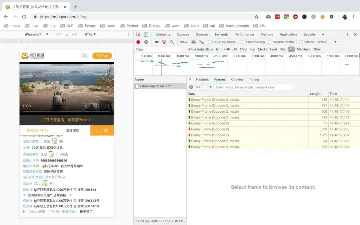 这个时候传输的弹幕消息已经没有加密过,直接对比,看到了一条“哈哈哈”的消息,所以我们现在可以确定就是这个websocket连接在传输相关消息。