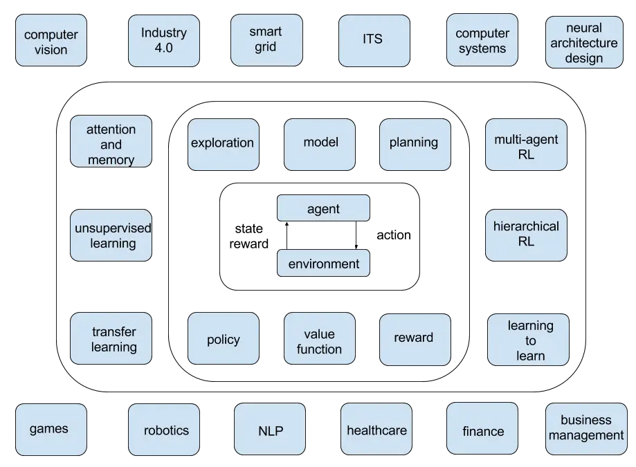 Figure 1 illustrates the conceptual organization of the overview. The agent-environment interaction sits in the center, around which are core elements: value function, policy, reward, model, planning, and exploration. Next come important mechanisms: attention and memory, unsupervised learning, transfer learning, multi-agent RL, hierarchical RL, and learning to learn. Then come various applications: games, robotics, NLP (natural language processing), computer vision, neural architecture design, personalized web services, healthcare, finance, Industry 4.0, smart grid, ITS (intelligent transportation systems), and computer systems.