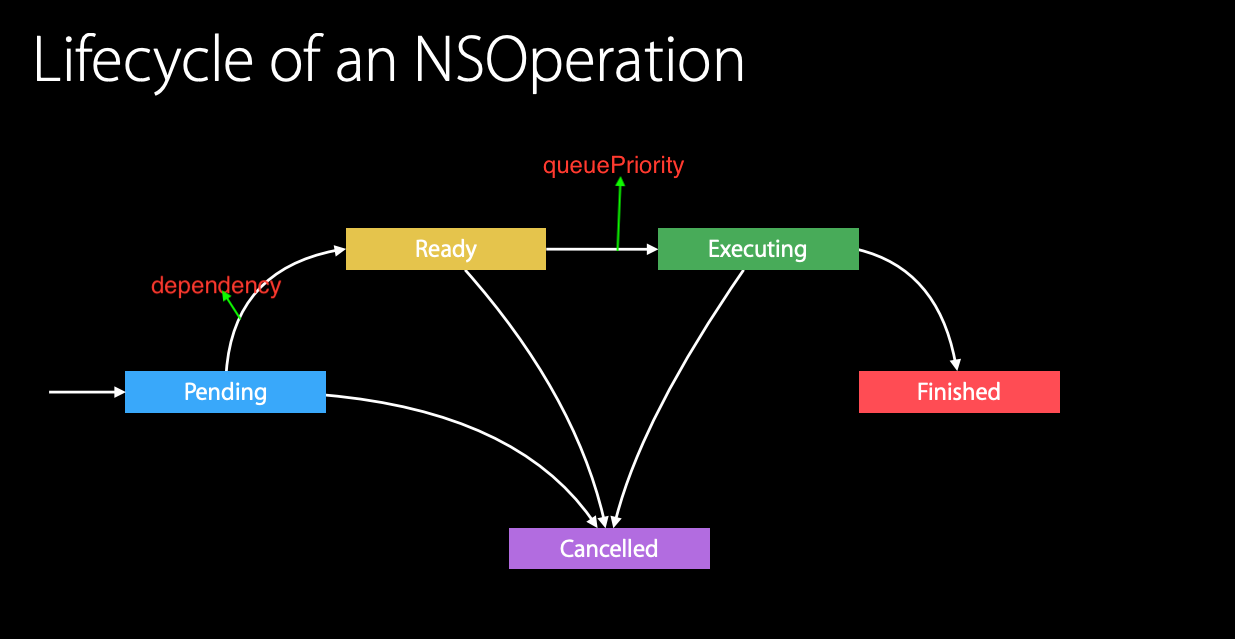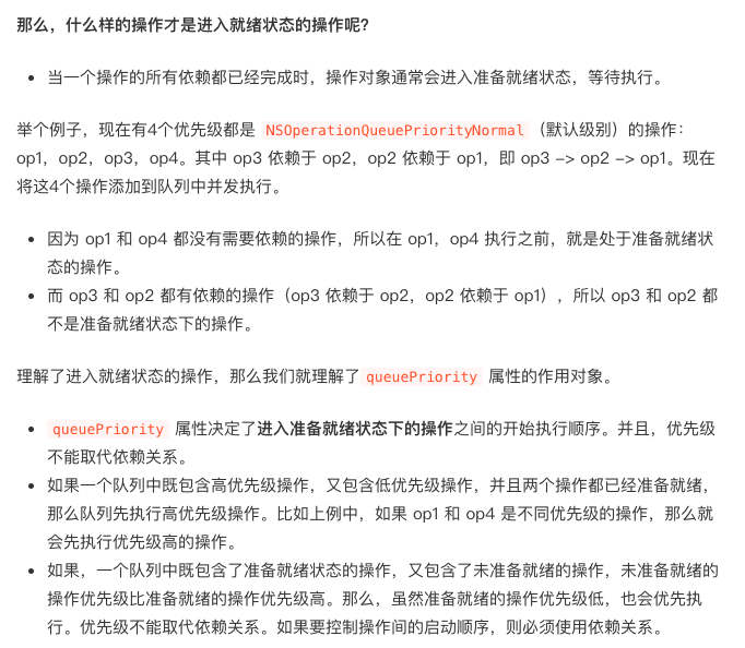 - 优先级设置之后会进入执行阶段。queuePriority属性决定了进入准备就绪状态下的操作之间的开始执行顺序。