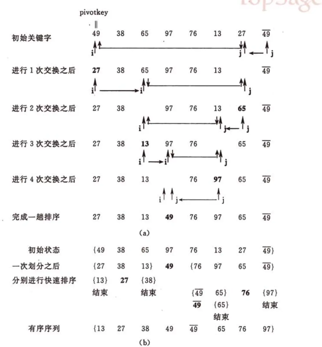 在分割数组中(假定是从小到大排序),我们使用low与high分别指向将要排序数组的第一个和最后一个元素。从high标记位置向前查询,直到找到一个比pivot元素小的元素,将它与low位置对应的元素交换。然后再从low位置向后查询,直到找到一个比pivot元素大的元素,将它与high位置进行交换。继续这样两端交换查询,对比,直到low==high,即low与high指向同一个元素,最后将pivot元素存放到low(或high)位置上,这样就完成了一轮数组分割。