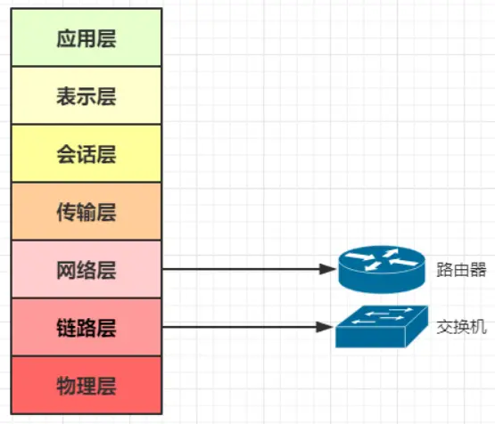 根据 OSI模型 的网络体系划分,自底向上,路由器 工作在第三层(网络层),而我们常说的 交换机 工作在第二层(链路层)(目前有更加高级的三层交换机,四层交换机,甚至还有七层交换机)