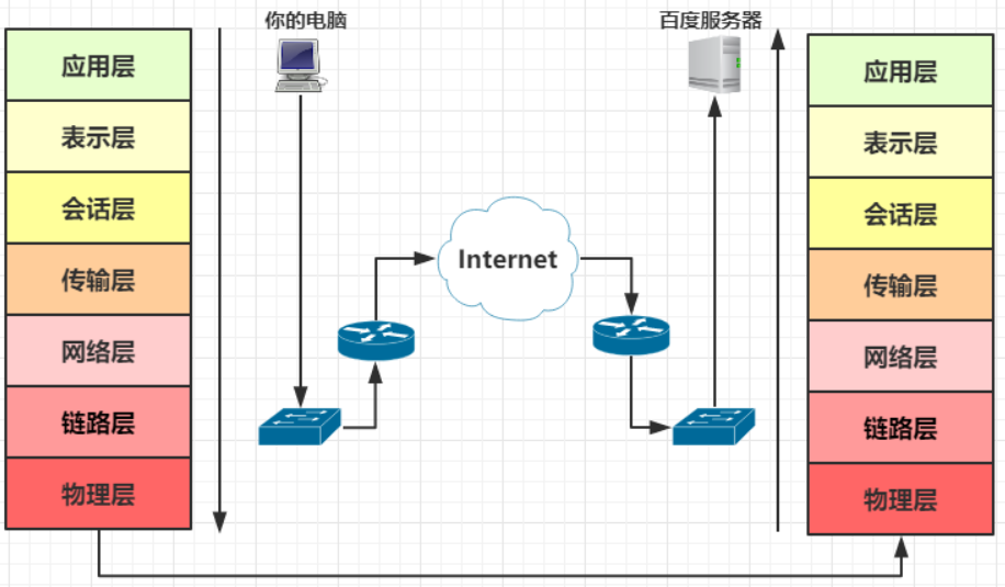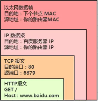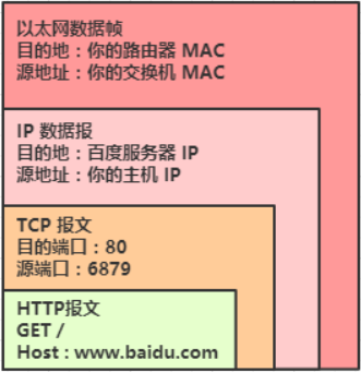 1.你的电脑先在应用层打包一个HTTP报文,然后在传输层在打包成TCP报文,然后再根据DNS查到的IP在网络层打包成 IP数据报,然后在通过链路层打包成以太网数据帧,发送给你的交换机: