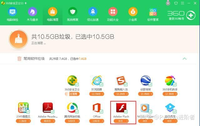 2、之后再使用360安全卫士软件中再次全盘清除Adobe Flash Player残余的文件,如下图所示。