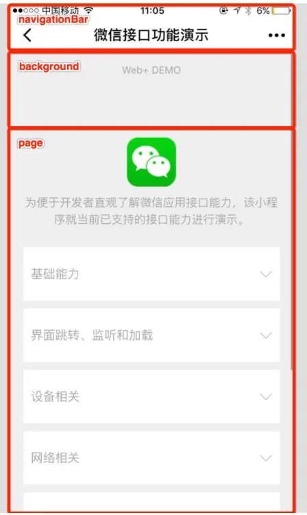 中,当小程序中下拉和上划时,整个页面会看到小程序的容器。这里了解一下小程序容器的结构。