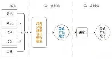 但软件开发不是。软件开发有两个层次:体力化的代码打写(编码)与思考层面的创造。我把程序员的工作过程绘制成图,可以简单明了地说明这一点,如图所示。