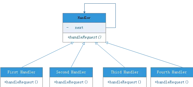 具体处理者(concrete Handler) : 实现Handler相关接口,并持有责任链上下一个处理者的引用。对输入的事件进行判断,符合条件则截断事件传递并进行处理,否则将事件接着往下传递。
