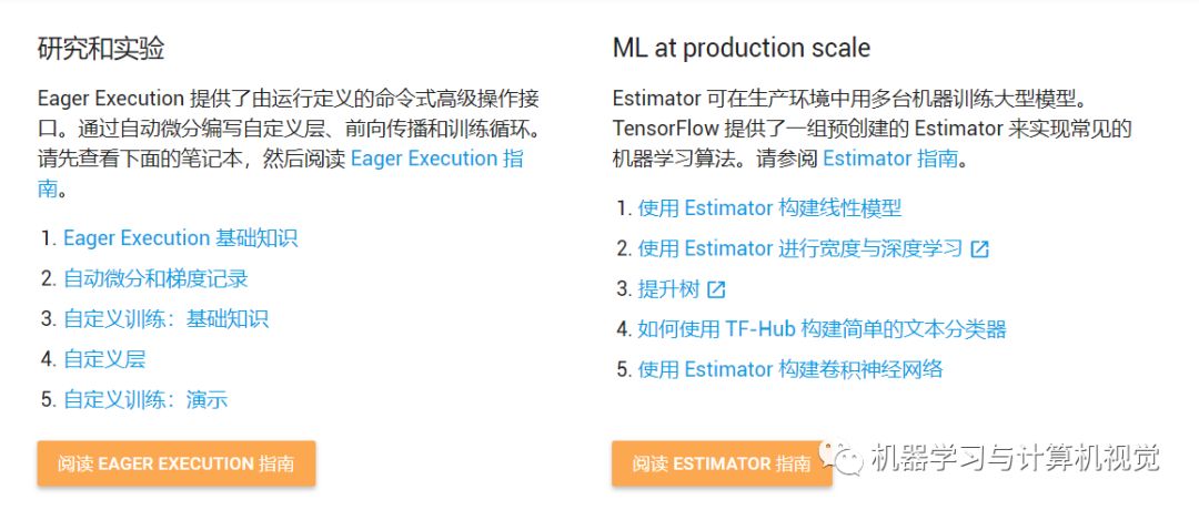 此外,应用在研究和实验方面的 Eager Execution 和分布式大规模训练的 Estimator 接口也有给出教程介绍使用。