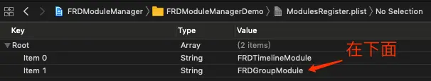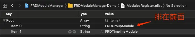 其实第2个缺点是可以避免的,我们可以调整plist文件中的类的顺序,来实现模块的调用顺序。我们拿FRDModuleManager的demo中的plist文件来验证一下。