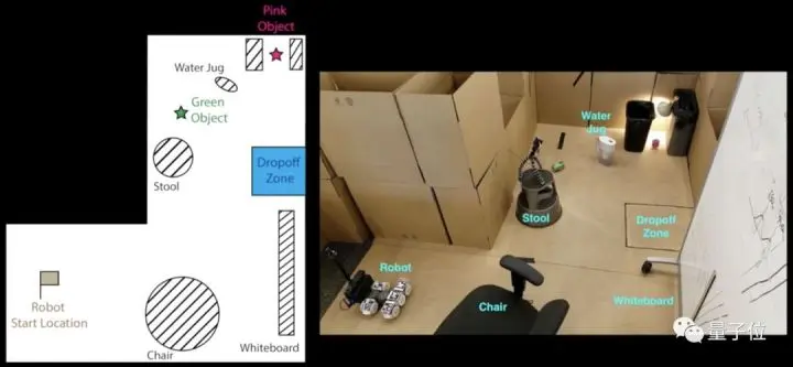 在这个逼仄的空间里,机器人要取到粉红色的物体,把它搬运到蓝色区域。