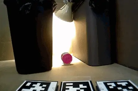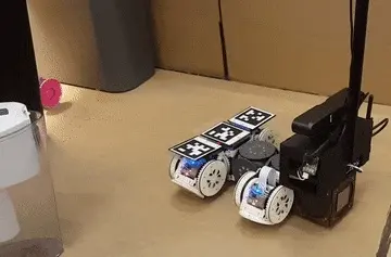 再往左拐,它看到了目标小粉,但是夹在两个垃圾桶之间,以机器人当前的身材很难抓到。