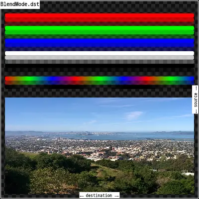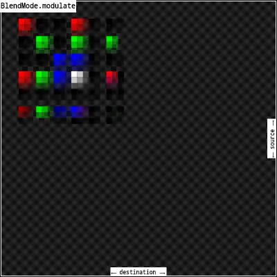 modulate: 将src和dst重叠部分混合,使混合部分颜色相乘,这只能导致相同或更深的颜色(乘以白色,1.0,结果没有变化;乘以黑色,得到黑色)。当合成两个不透明的图像时,其效果类似于将屏幕上的两个透明度重叠。如果src或dst考虑透明度,可以使用[multiply]