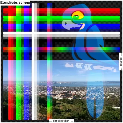 screen: 将src图像和dst图像的分量的倒数相乘,并将结果的倒数相乘。反转组件意味着将完全饱和通道(不透明的白色)视为值0.0,而通常将值0.0(黑色、透明)视为值1.0。这与[modulate]混合模式本质上是相同的,但是在乘法运算之前颜色的值是倒过来的,在渲染之前结果是倒过来的。这只能导致相同或更浅的颜色(乘以黑色,1.0,结果没有变化;乘以白色,0.0,结果是白色)。同样,在alpha通道中,它只能产生更不透明的颜色。这与两个同时在同一屏幕上显示图像的投影仪有相似的效果。