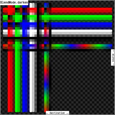 darken:通过从每个颜色通道中选择最小值来组合源图像和目标图像。输出图像的不透明度计算方法与[srcOver]相同。