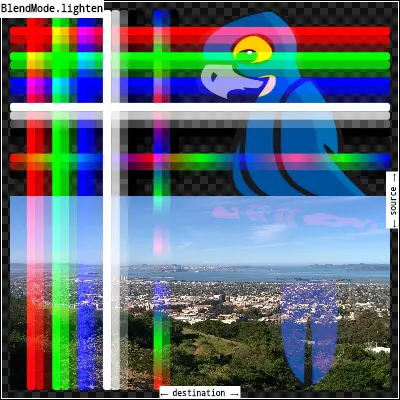 lighten: 通过从每个颜色通道中选择最大值来组合源图像和目标图像。输出图像的不透明度计算方法与[srcOver]相同。