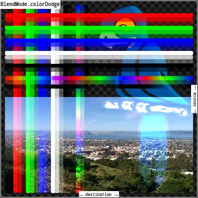 colorDodge:用src的倒数除以dst。反转组件意味着将完全饱和通道(不透明的白色)视为值0.0,而通常将值0.0(黑色、透明)视为值1.0。