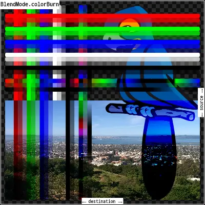 colorBurn:用dst函数的倒数除以src函数的倒数,然后求结果的倒数。反转组件意味着将完全饱和通道(不透明的白色)视为值0.0,而通常将值0.0(黑色、透明)视为值1.0。