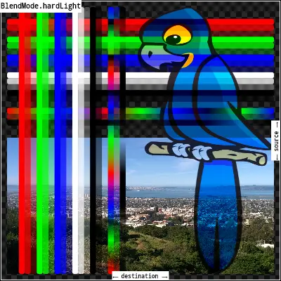 hardLight:将src图像和dst图像的组件相乘,然后对它们进行调整,使之有利于src。具体来说,如果src值更小,则将其与dst值相乘,而如果dst值更小,则将dst值的倒数与src值的倒数相乘,然后将结果相乘。反转组件意味着将完全饱和通道(不透明的白色)视为值0.0,而通常将值0.0(黑色、透明)视为值1.0。